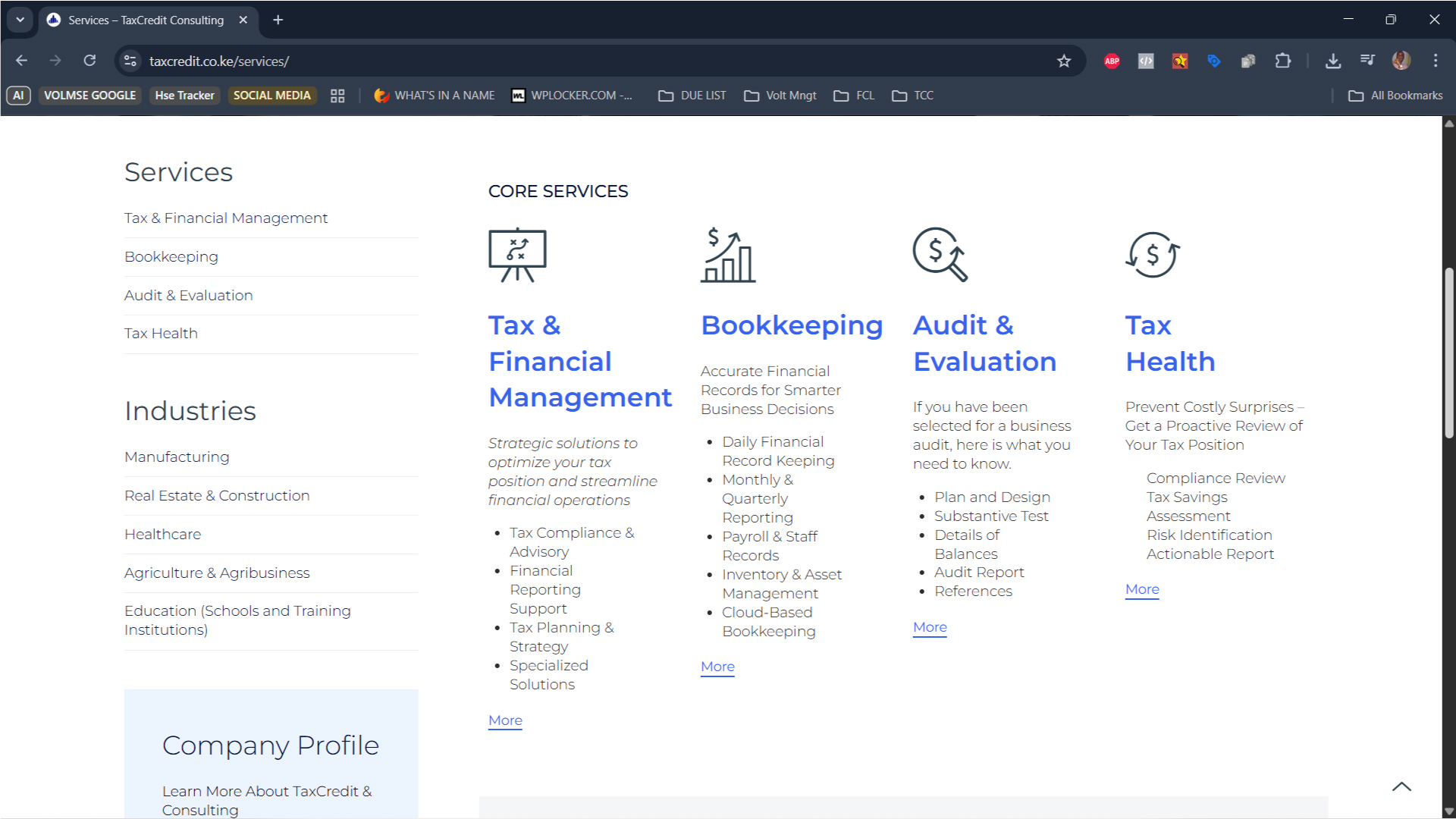 TaxCredit Consulting Ltd is a Kenyan tax & compliance advisory firm led by FCPA Wycliffe Kibisu. With 15-20 years of expertise, they serve SMEs, large corporates, and industries across sectors (manufacturing, healthcare, real estate, tech, agriculture) assisting in audit assurance, tax planning, financial management, and compliance.